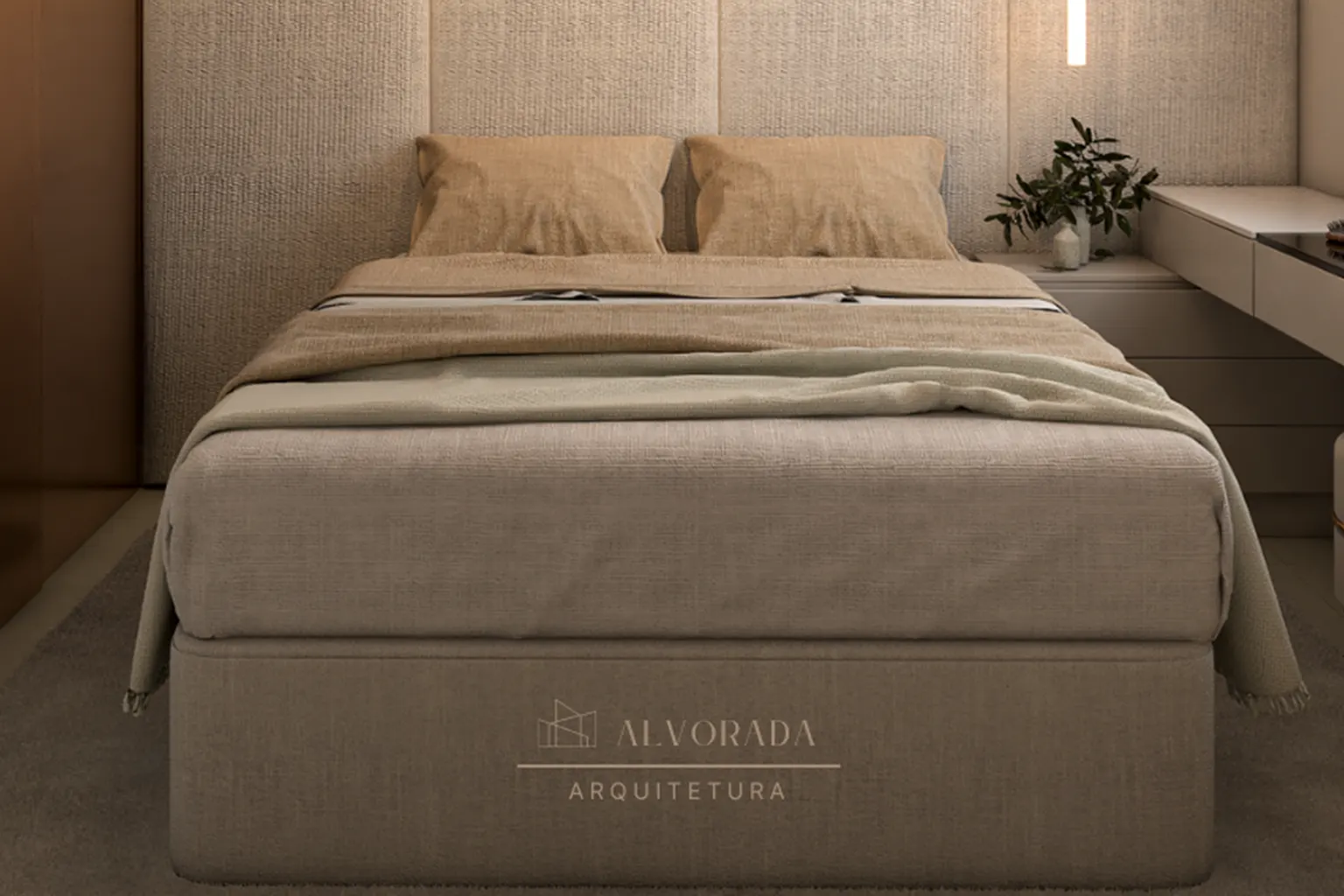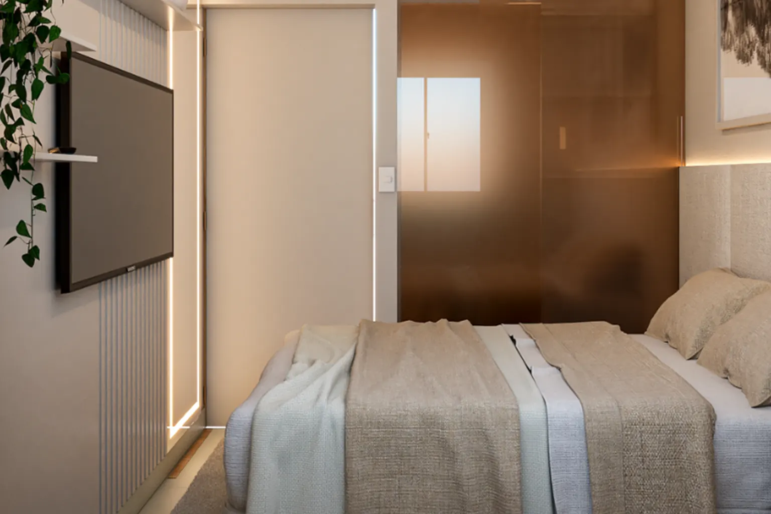 Nos dormitórios, o design foi pensado para garantir conforto e praticidade, com soluções compactas de mobiliário, iluminação indireta e paleta de cores neutras, que contribuem para uma atmosfera acolhedora e contemporânea.