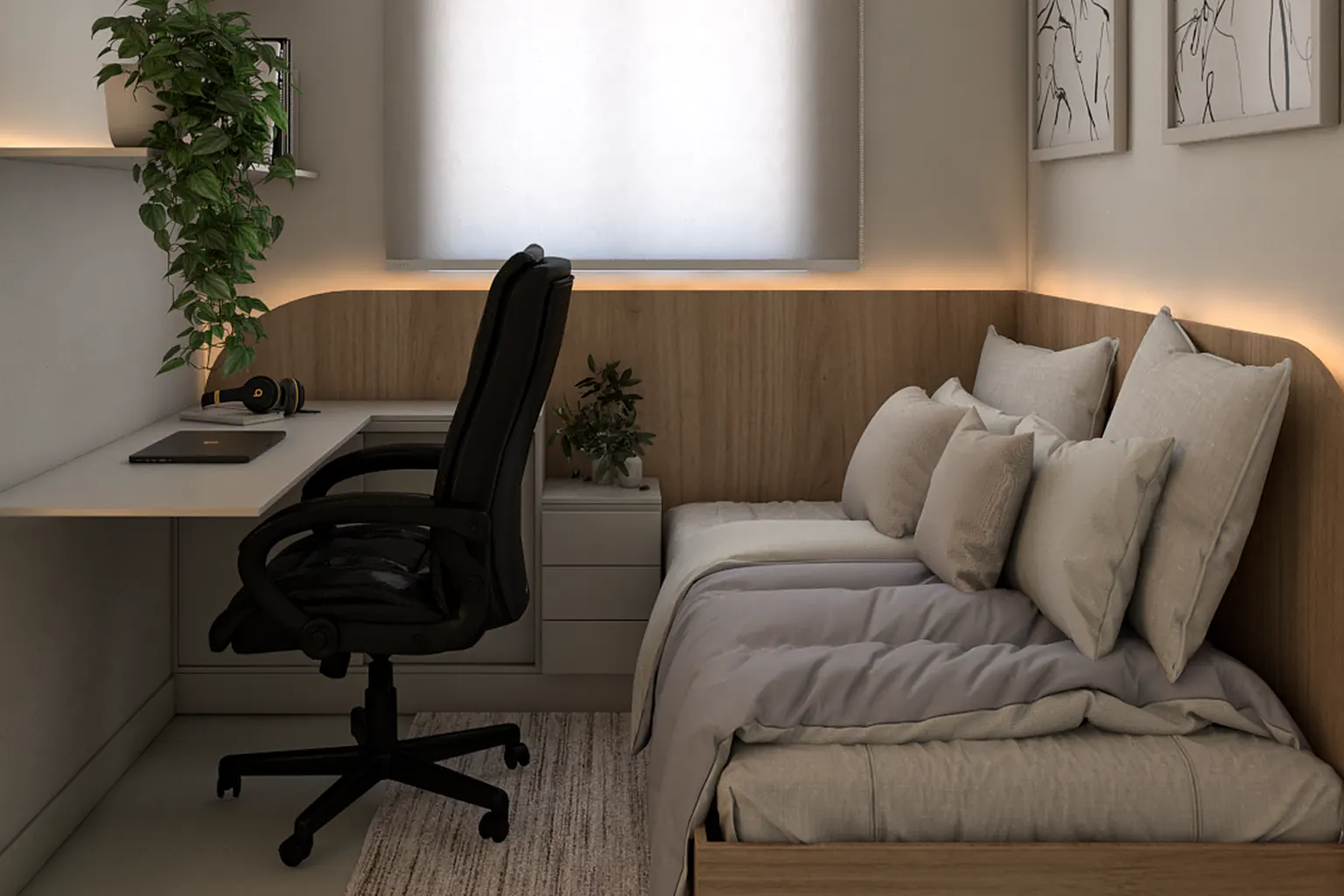 O projeto também incorpora espaço de trabalho integrado, atendendo às necessidades de home office dentro de um layout compacto.