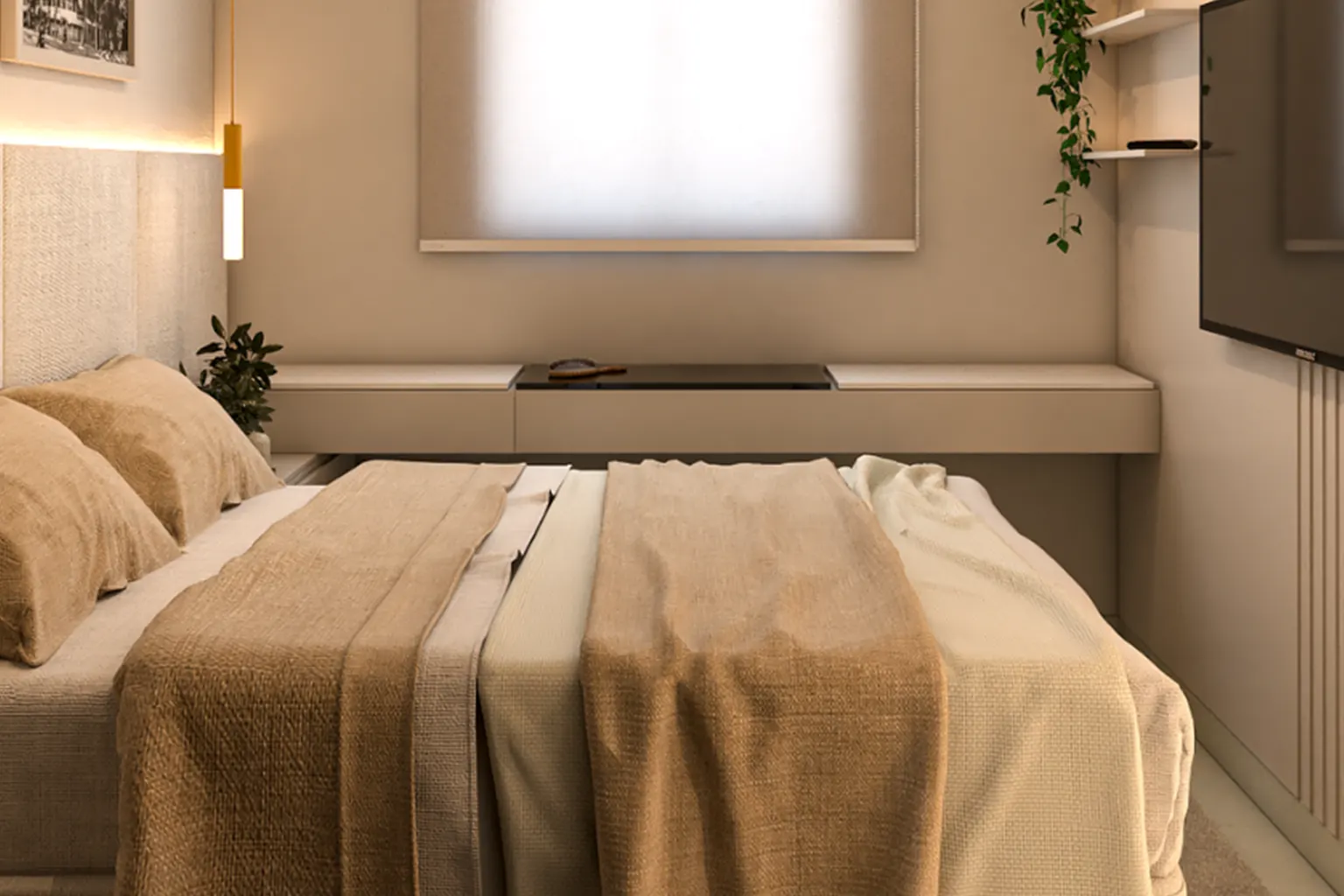 Nos dormitórios, o design foi pensado para garantir conforto e praticidade, com soluções compactas de mobiliário, iluminação indireta e paleta de cores neutras, que contribuem para uma atmosfera acolhedora e contemporânea.