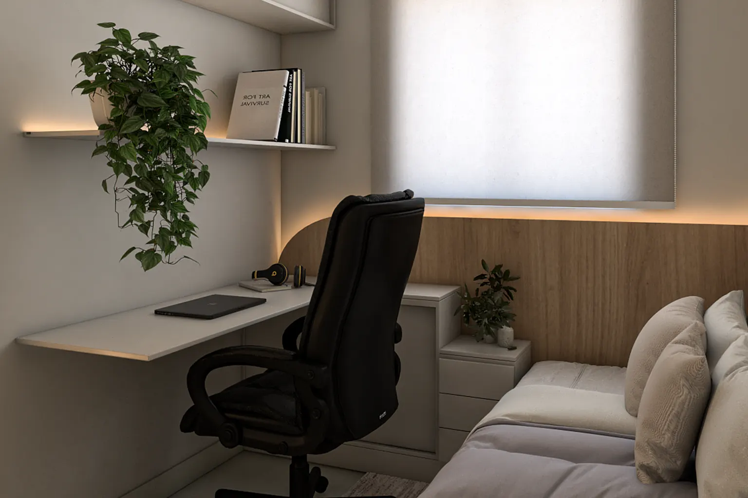 O projeto também incorpora espaço de trabalho integrado, atendendo às necessidades de home office dentro de um layout compacto.